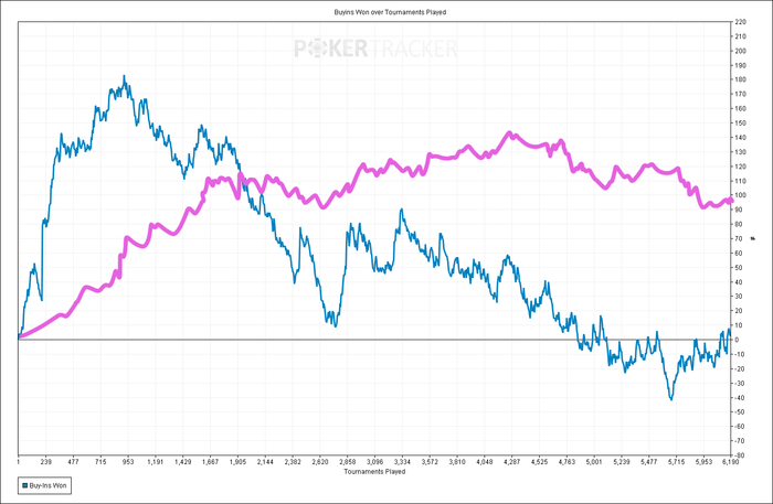 Наиграл пока чуть больше 6к турниров. Это всего 92 000 раздач. На старзах у меня только за 5 000 спинов около 100 000 раздач наигрывалось, если я ничего не путаю. На редстаре более быстрая структура, раздачи более короткие и простые. Играешь больше, устаешь меньше.