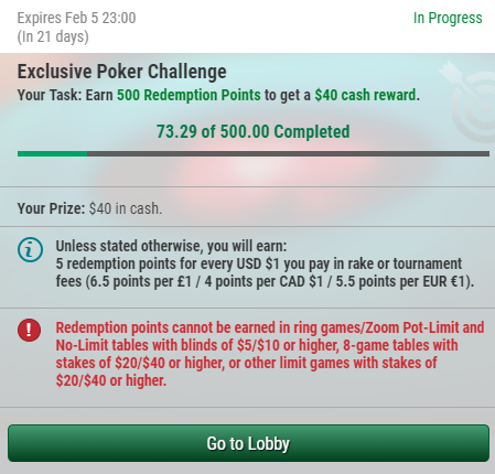 Перевел половина БР на Старзы, чтобы покатать Zoom NL10 по акции на рейкбек (задания), выйдет больше, чем на Пати, да и поле слаще. Если правильно посчитал, то РБ будет 40% по этой акции. Чтобы получить $40 РБ, надо будет заплатить $100 рейка: Начало положено, график прилагается: Хороший получится челлендж для меня в плане дистанции и дисциплины, т.к. минимум по 1к рук в день надо будет наигрывать.