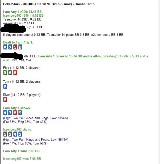 Зверобой какой-то агрессивный дядя (не в плане игры, а в плане общения), несколько раз замечал до этого, что мне или кому-то писал маты в разных турнирах на ровном месте, не обращал на это внимания, мало ли дурачков играет, но те случаи запомнились, на этой финалке он проиграл выставление, остался с 0.5 бб, выругался на оппа, тот в него кинул какашкой, я добавил и от чиплидера третья какашка в него прилетела видимо не мне одному его манера общаться запомнилась))))