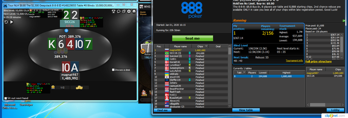 Засадил за три последние сессии -1к. Сегодня все началось так же грустно. Потом чуть отпустило, уехал 8 (предфиналка) гладиатора по 22, 10(тоже предфиналка) баунти хантера по 22. В сумме 500+ с этих двух турниров дали. Затем доехал по 11 на пати. На этом пздц не закончился и доехал до 2 места на 888 (пко за 22). Сейчас доигрываю в топ 50 коротким стеком по 55 уе на восьмерках.
