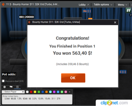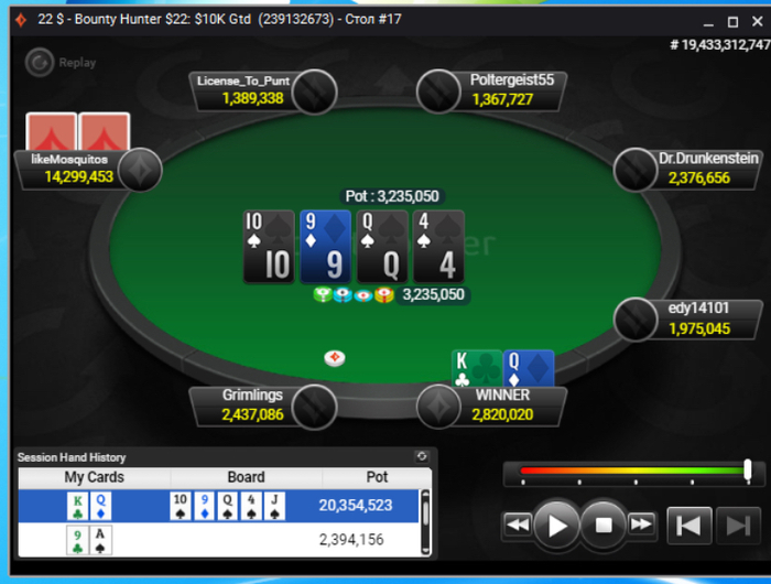Вчера хорошо дипранилось на пати. Была дорогая для меня финалка (22хантер, около 2к за 1). Сыграл лимп кол против агрессивного большого чипака. За две банки он поставил меня под олын, решил вскрывать, посмотрел на двух королей,350 баксов. В целом после закрытия пс пошёл хороший ран, но либо ошибки либо не складывается на финальных столах, в итоге потом буду кусать локти. Продолжу работать на игрой.
