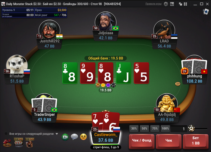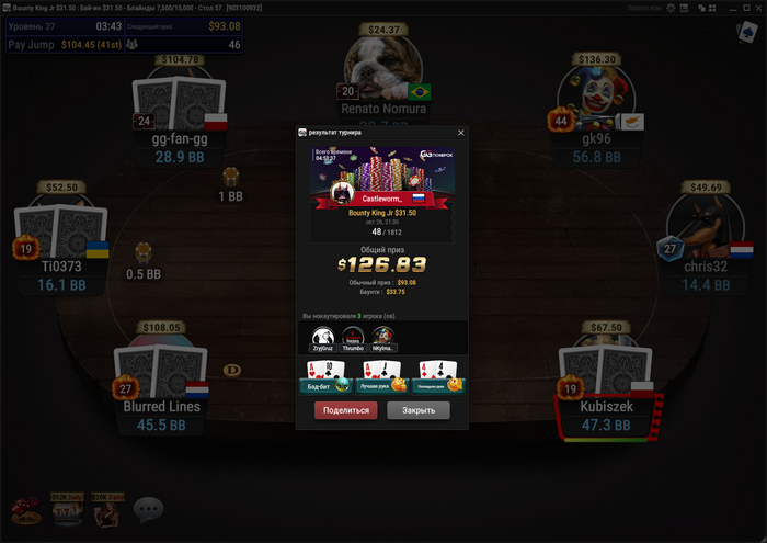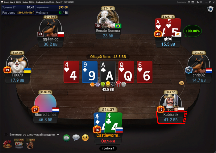 Сделал ещё три глубоких прохода, но в 2 из 3 не устоял в монетках за чиплидерский стэк (37 из 2,3к+ в GGMasters $25 и какой-то там в Bounty King Jr $31,5)