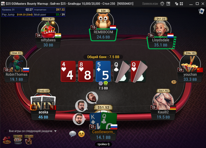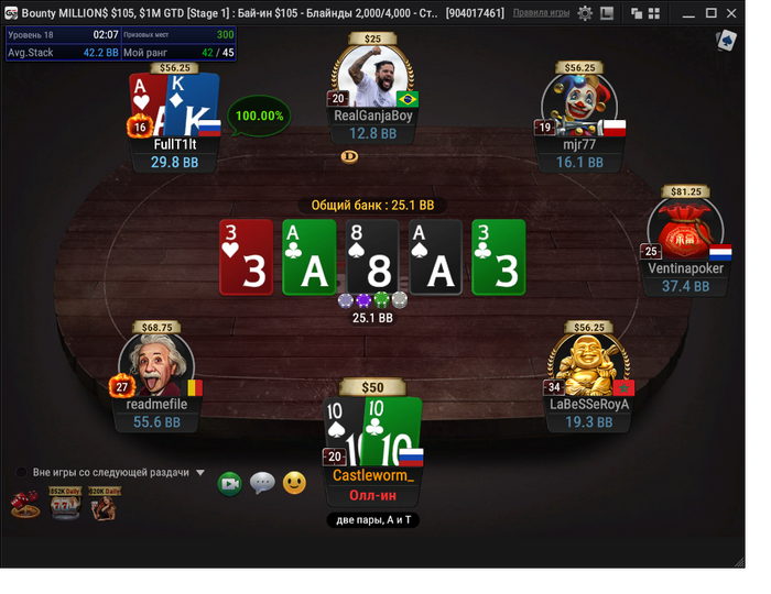 Сегодня очень жёстко не складывалось. Плюс вылетел за 2 минуты до окончания первого дня в Bounty Millions $105 - раздали в коротком стэке 11бб в . Не устояли. Немного боли для сопереживающих ниже. Вообще, я это выкладываю не для того, чтобы поныть - чтобы люди, которым также больно понимали, что они не одиноки - просто надо всё делать правильно и будет топ-1!