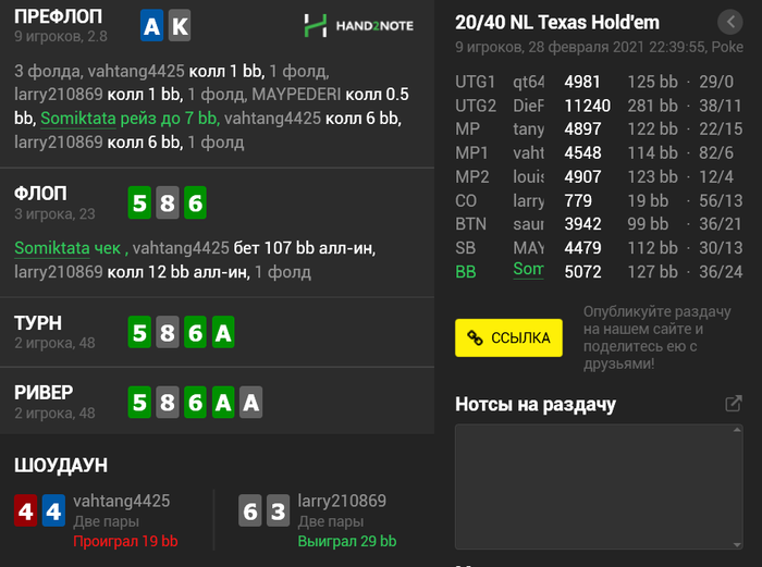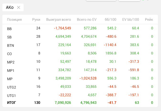 1. Оказывает АКо я играю на -41бб/100, когда по ЕВ должно быть 60бб/100. Действительно, когда не попадаю во флоп, просто начинаю чекать... Удивительно, что в самой выгодной позе- бтн, она просто улетает куда то в пропасть... Определенно нужно менять стратегию с этой рукой или такими темпами ее выгоднее фолдить префлоп мне)) Причем, АДо разыграна в хороший плюс. Сегодня, кстати, была интересная раздача с этой рукой против двоих фишей. Я изолю, получаю 2 кола, выпадает мелкий стрит-флеш дро борд, я чек, и тут летит пуш на 100бб, я фолд и вот те шоудаун....
