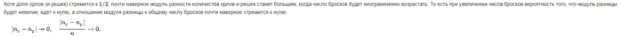 scenotaph, Окей, объяснено заебись, спасибо, кажется, что тоже самое до мне пытался донести deSolAl. Правильно понимаю, что на примере в числах это будет выглядеть следующим образом: на любой конечной дистанции может выпасть любое количество орлов или решек. Допустим есть шанс на триллион решек подряд, он невероятно мал, но не равняется нулю. Поэтому если например у нас за 10 миллионов подбрасываний выпало 9 миллионов решек и 1 миллион орлов - мы все равно не можем ставить на орла, так как за следующий трилион рук могут хоть выпасть все решки, вероятность этого есть, соответственно мы не получаем никакого +ев от 50/50 события. А орлы вернутся ближе к 50% тогда, когда захотят, хоть через триллиард триллионов бросков и нам может не хватить жизни, чтобы дождаться этого. То есть при вечной жизни было бы всё же выгодно ставить на орла?