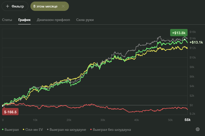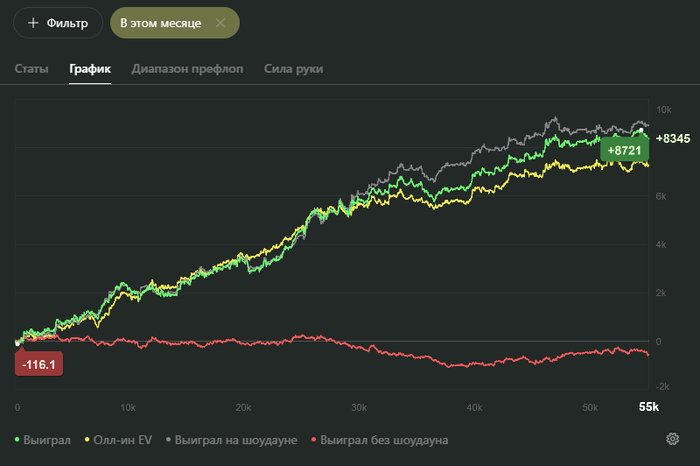 Из моих знакомых Серёга один из самых трудолюбивых и дисциплинированных покеристов. Закономерный и заслуженный результат👏 Браво!