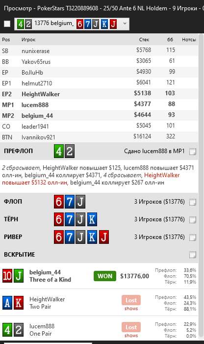 Письменно разобрала пару раздач, прониклась собственным профессионализмом тупизмом. Продолжаю развлекаться с составлением ренджей. Чего-то я зависла на этом этапе. Хочется просчитать и составить свои ренджи, чтобы глубже понять, почему мы совершаем те или иные действия в различных ситуациях, но говорят, что для этого нужен дорогущий солвер. Такое я себе пока еще не могу позволить. Ладно, буду дальше ползти в направлении успеха) Всем профита!