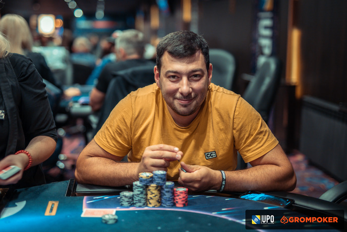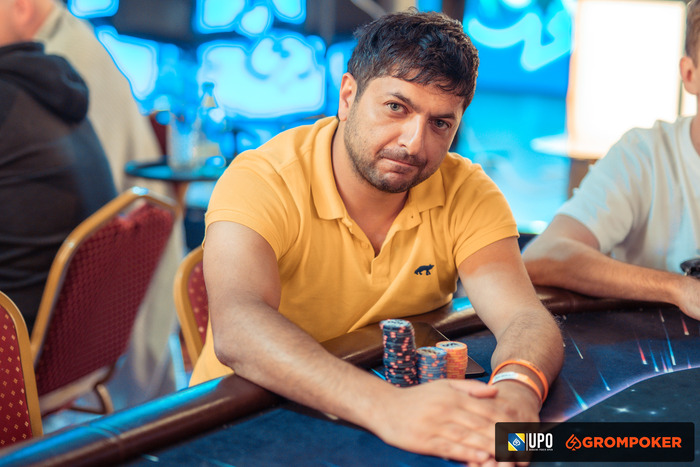 У Джукия осталось всего 900 фишек, которые он отправил в центр стола вслепую в следующей же раздаче. На баттоне Андрей Мельник перекрутил до 3,500, Агарази Бабаев на большом блаинде доставил. По флопу оппоненты поставили по 5,000, а по терну Агарази сдался на ставку 10,000 от Мельника.