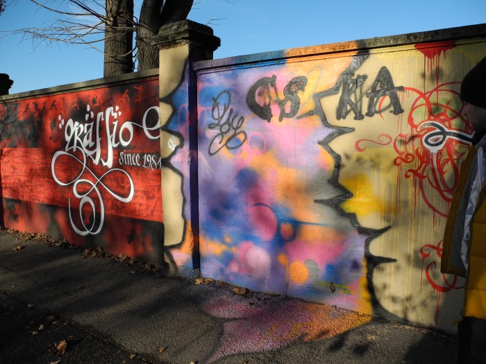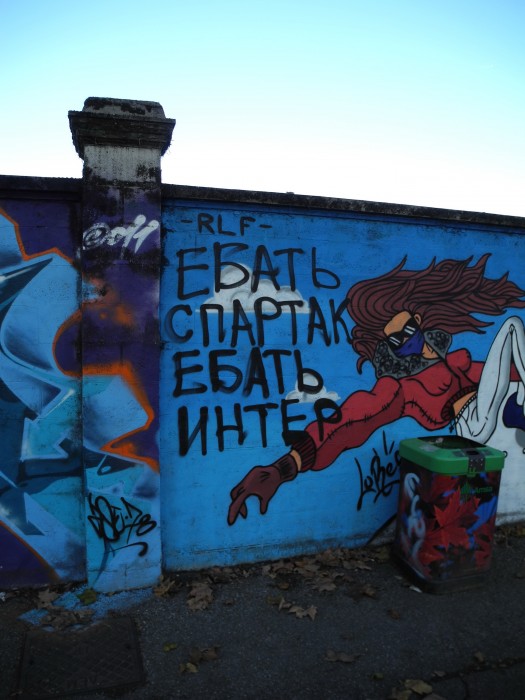 Метров на 300 протянулась стена с граффити, где был четко виден след фанов ЦСКА: