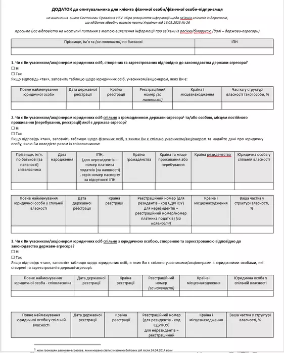просимо Вас відповісти на наступні питання з метою виявлення інформації про зв’язки із росією/білоруссю (далі – держави-агресори)