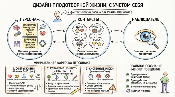 - Software: убеждения («нельзя ошибаться»), привычки, сценарии («беру больше, чем тяну, и выгораю»). Это переписывается. Стратегия — осознавать и пересобирать.