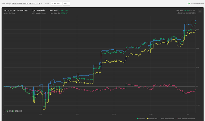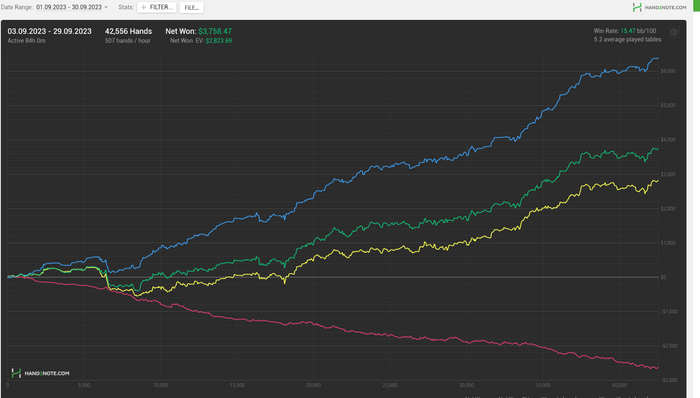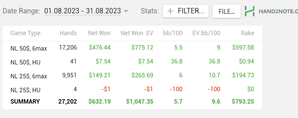 Часов супер мало пиздец. Сложно катать больше 6 часов в день. Мои мозги дико перегорают и скатываются в полный автопилот где я пару раз выкинул топ пару на сбет треть. Было еще где то 15 часов в другом руме без трэкера на стримах и 10 часов теории мэйби. Короче я чувствую что в плане продуктивности я выложился на 50%, не больше. При этом фортуна во всю поощеряла моё распиздяйство. Не удивлюсь если следующий месяц я запотею на 150ч+ и выхлоп будет меньше чем за этот.