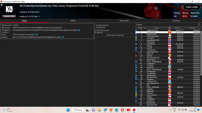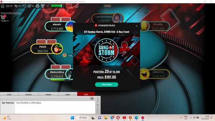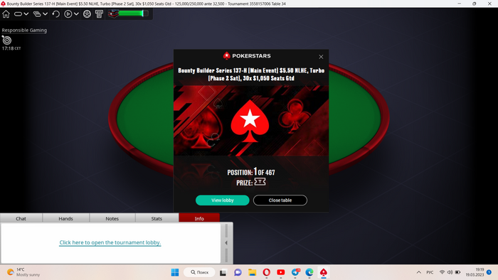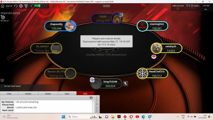 Получилось с первой пули(и той выигранной в каком-то извращренном нок сате) набить неплохой стек. Турик, конечно, лучший по составам в таких байинах в году. За первым столом было 7 любителей, аби не всех у которых дотягивало до доллара и никого не превышало 10. Не откажусь от такого стартового стола и во втором дне! Аминь!