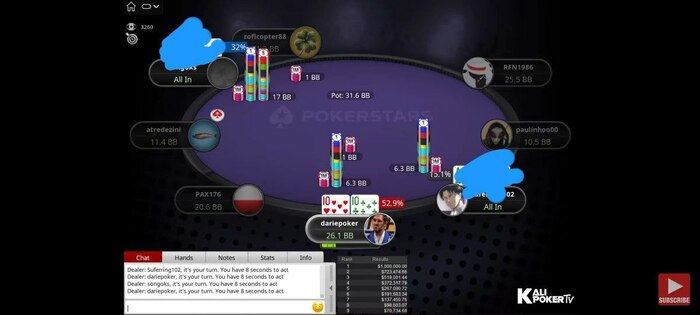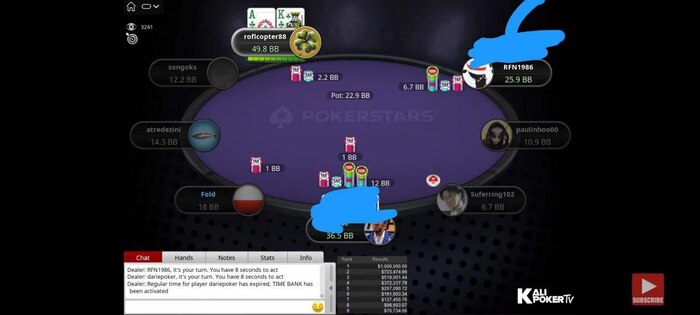 Долгое время не раздавали вообще играбельных рук, стек просел, сидел, выживал. А как только раскрутился до не пушфолдного стека отгрузил в двух выставлениях подряд одному оппу.