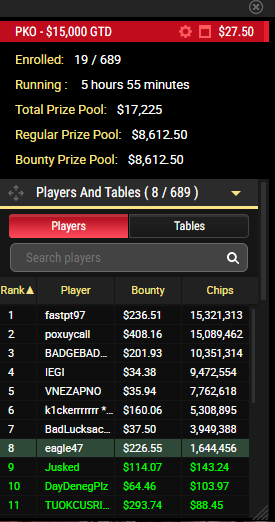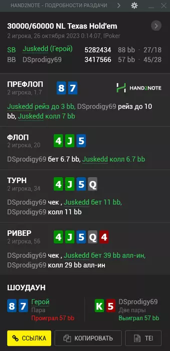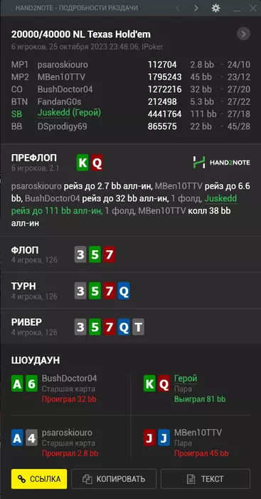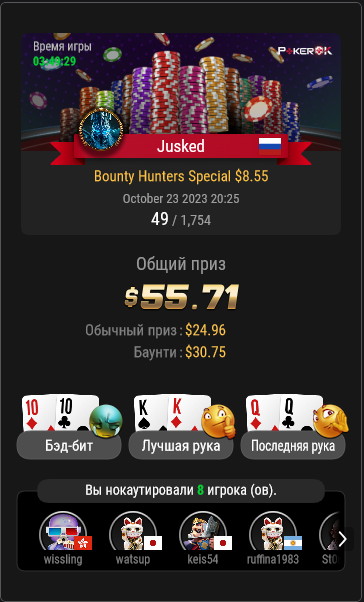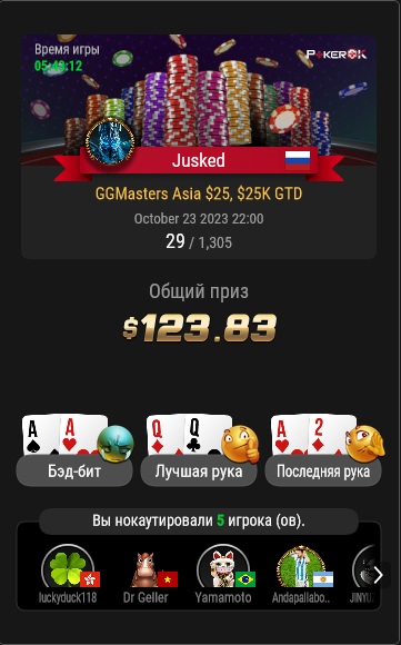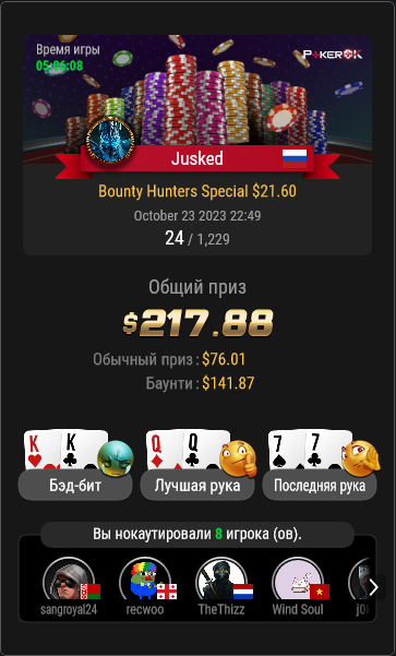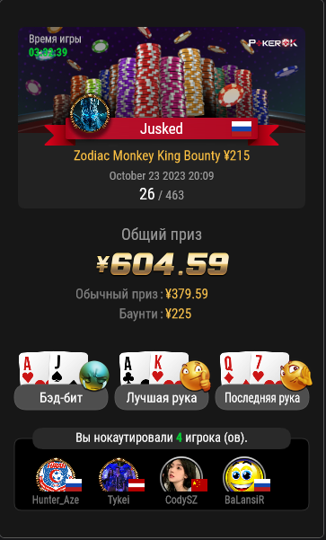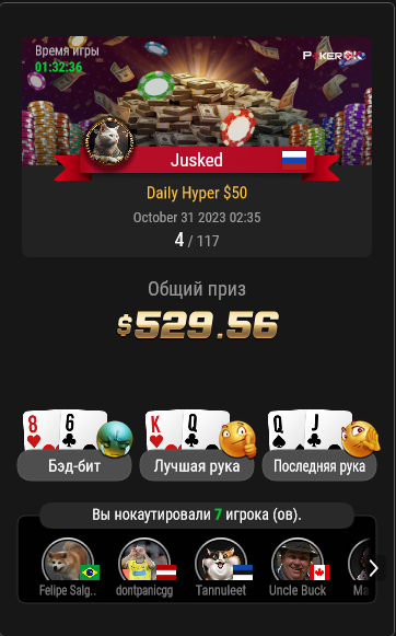 Jusked @ 31.10.23Игрок может вылететь из турнира, но если при этом он совершил положительное по ev действие, оно отразится в виде зеленых циферок.