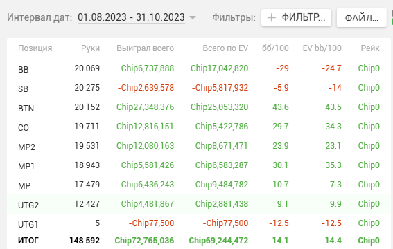 Поэтому считаю что в таком слабом поле и 100к рук достаточно, чтобы можно было с уверенностью сказать как играет человек, взглянув на его винрейты.