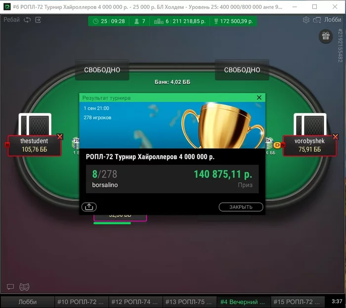 4) По остальным играм (Стад, разз, бадуги, 6+) отыграл плюс +80к , так как бай-инился немного и было второе место в Техас 6+