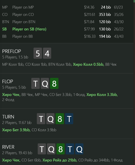 Тут я думаю смог хорошо сдаться ривер ведь кране сомневаюсь, что фэ тут хорошее, не факт что Ах будет фолдить и придя к этим выводам я нажал чек.