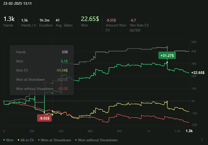 Перерыв от покера явно пошел мне на пользу в плане менталки. Перестал испытывать давление денег на NL10 от слова совсем. Чему я очень рад, потому что игра стала совсем другой. Могу сделать пограничный колл и не париться за проигрыш. Могу где-то сыграть агрессивно, где раньше не мог. В общем, игра стала приносить огромное удовольствие.