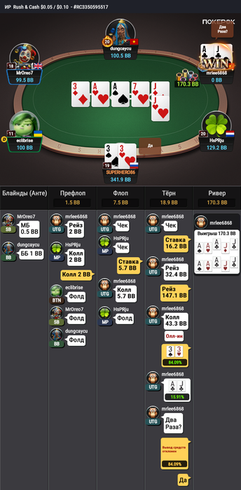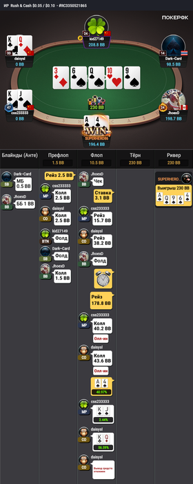 Вы можете сказать, что колл с 33 плохой, но учитывая не полный стек оппонента я решил зайти в этот мультипот.
