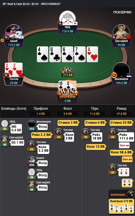Сижу. Вижу ракеты. Прилетает инста пуш 150бб. Нажимаю колл. Кладу его на КК-AKs. Смотрю на его руку. Оуеваю...