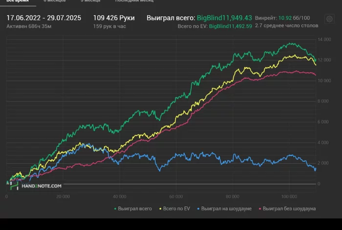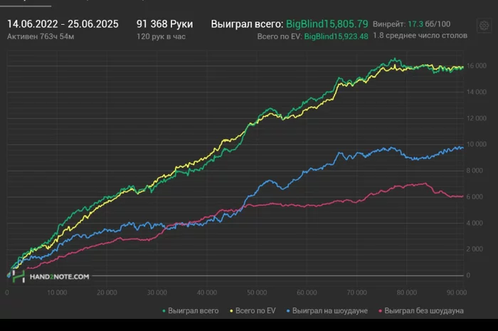 И в целом несмотря на то что неплохо плюсанул - очень недоволен своей игрой, типа если бы не мистери случайный то закончил около нуля. И по ев все вытащило два тура, веник допустим 1200 рук сегодня в ноль откатал. При том что нигде не куллерило, нигде сам не отъезжал.