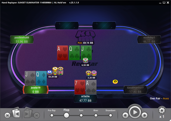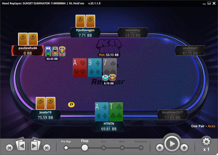 P.S. Против другого фиша в куда более приятной ситуации для колла скинул AT просто потому что он не пихал флопы с минимальным попаданием, думаю там просто две пары были.