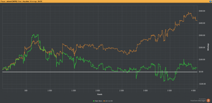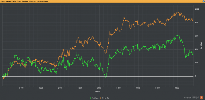 Не знаю это апнуло, но такого вон на шоудане у меня не было давно, больше 1млн. рук). Скорее всего чуть подстроился к особенности игры. Народу похер часто ты их 3бетишь или рейзишь постфлоп, они всё равно с радостью загружаются с тобой на разной хуите. Всё же часть плюса можно списать на удачное распределение по лимитам, приятнее наживать на верхних).