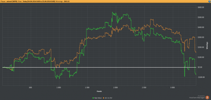 Катаю пока, ничего нового не происходит. До мая пару недель и все мои развлечения это будет пойти полечить зубы. Погода дождливая, за окном уныло. Не знаю что должно произойти чтобы я расшевелился). Ещё проблемка, что катать тоже несколько заебало,, но 3.5к рук как-то отыгрываю, ниже график в ББ. В деньгах 670у.е. недобора , но пока терпимо.