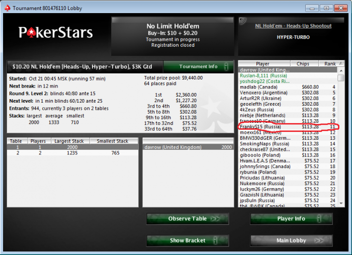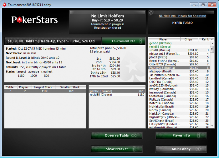 Вчера и сегодня вёл поиски турниров на старзах, которые можно включать в список турниров помимо ZOOM мтт. Нашёл. $10.20 Heads-Up Hyper-Turbo 1000 фишек, блины 20/40 40/80 80/160 и тд. Обычно игра решается в 20-30 рук, иногда можно порешать и первой рукой. В день их идёт немного. По времени так: 19.45 21.45 00.45 2.45 Это то, что влазиет в мою сессию. Почему именно они.