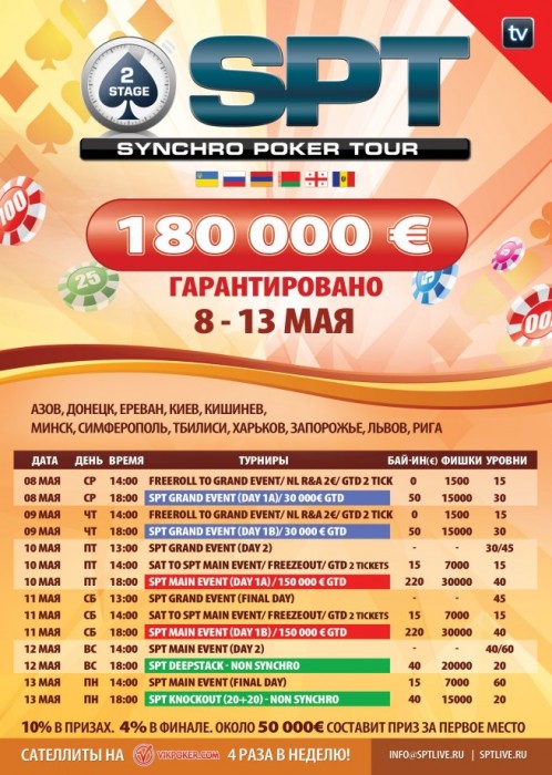 Я конечно не претендую, что мое мнение услышат, но я бы предложил организаторам провести второй этап на неделю позже, все-таки майские праздники, и народу может больше приехать или придти на турниры, все-таки большинство игроков не профессионалы, а в России как раз будут первомайские праздники и многие смогут поехать в другие города поиграть в покер...