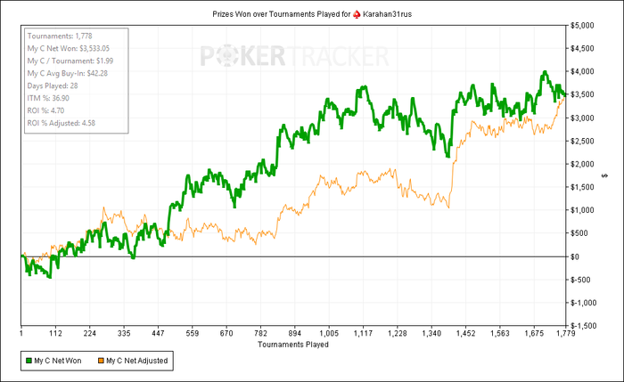Самая хреновая суббота в этом году, столов было мало и составы не очень.. Сыграл кучу лишних раздач, плюс ошибки в пуш/фолде, в итоге по ев недобрал всего 200 баксов.