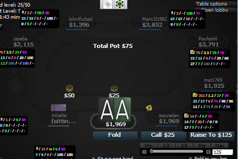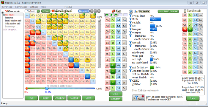 Взял за правило, а точнее - по совету хорошего друга,перед сессией делать разбор предыдущей. Работы куча, желание валом, прушности не хватает Кулера, переезды, не без них, обидно конечно, но это, так сказать, излишки и рабочие моменты. Сыграл одну плохуя раздачу против фиша и отгрузил ему 40 с хером бб. Да, я частенько рисую себе в голове меганатсы у оппонентов или совершаю тупые фолды или колы по риверу, над этим работаем... Собственно по раздаче - опп фиш агрессия 4 впип 50 остальное = зеро. выборки нет и соответственно инфы что он полный олень, тоже. Исхожу сейчас из его розыгрыша, а не из того,что знаю его руку. Идет мин донк - это все Ах с попаданием в мелкую пару флопа, оверкарты с крестушкой, которые пытаються задешево докупить флаш, и тупо всякая муть которая схватила пару на флопе и проверяет что и как. Не нравиться сейчас размер рейза моего, тут достаточно 600 и в случае если опп колит и на терн выходит бланк мы пушим или колим пуш от него, если же он пушит на наш рейз, что и сделал опп, то тут скорее фолд, т.к. в лучшем случае мы выставимся с мелкой карманкой и ФД, либо же с ФД и оверкартами. Опять же своим рейзом мы привязываем себя к банку против бб и против всего его рейнджа у нас какбы и есть 33% но чаще, после лимп-пуша, фиши показывают натсы. Вобщем нагородил тут кучу слов, раздачки такие малость раздражают Попытался разобрать раздачу в флоппзилле и если все правильно сделал, то у нас нихрена нет 33%. ХЗ, судите сами, я то