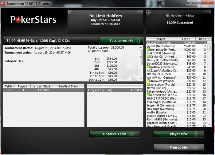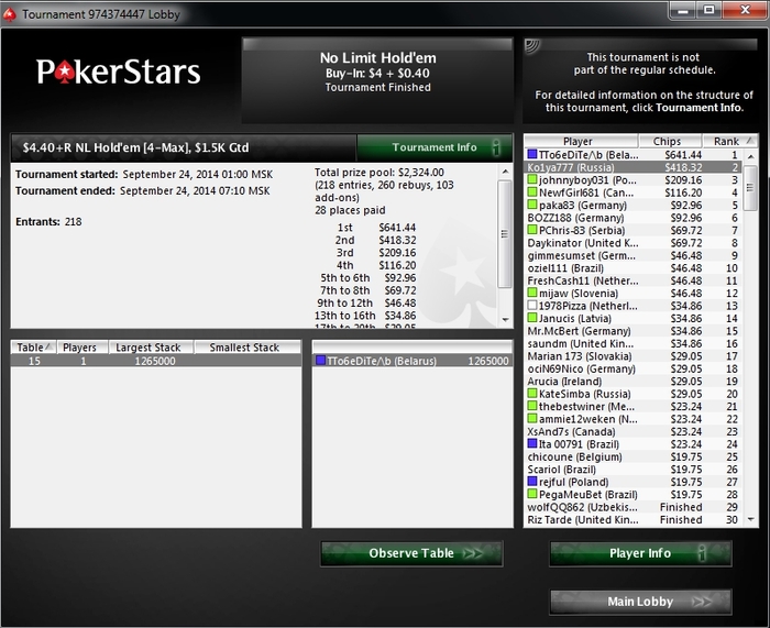 Пустота @ 29.8.2014 Poker Stars, $4 Buy-in (600/1,200 blinds, 150 ante) No Limit Hold'em Tournament, 3 Players Poker Tools Powered By Holdem Manager - The Ultimate Poker Software Suite.