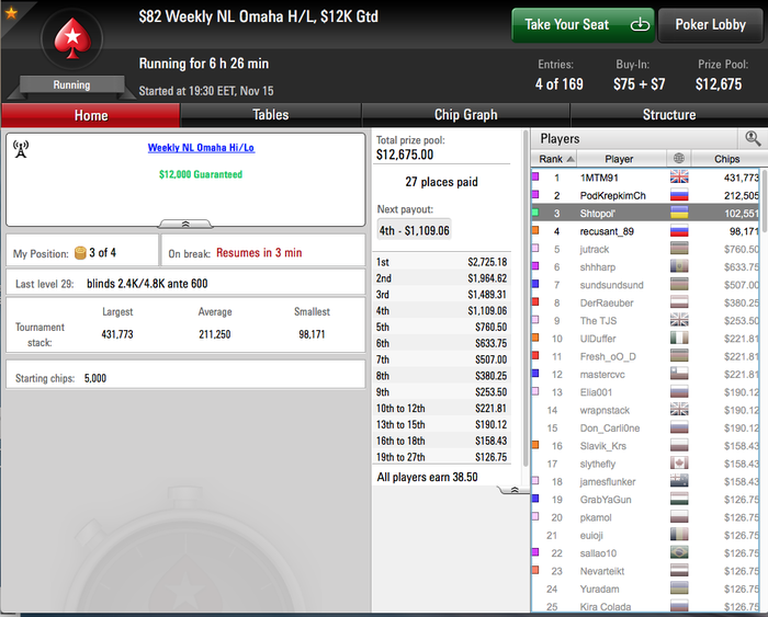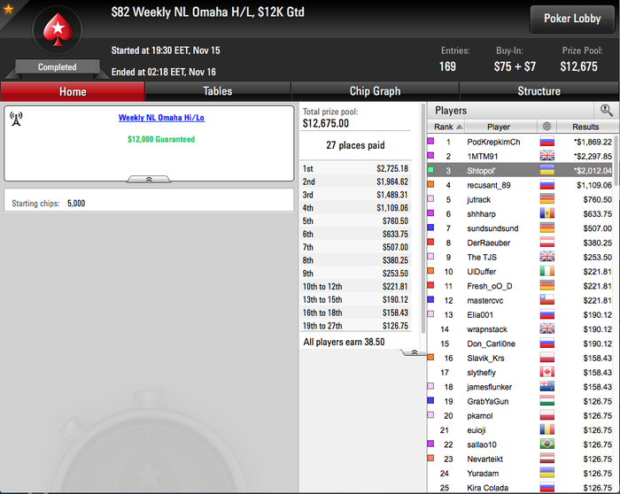 PokerStars - $15+$1.50|2500/5000 PL Hi/Lo - Omaha Hi/Lo - 7 players