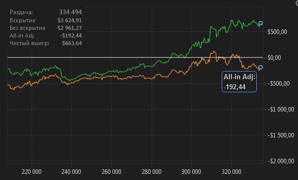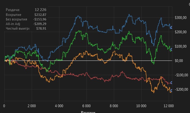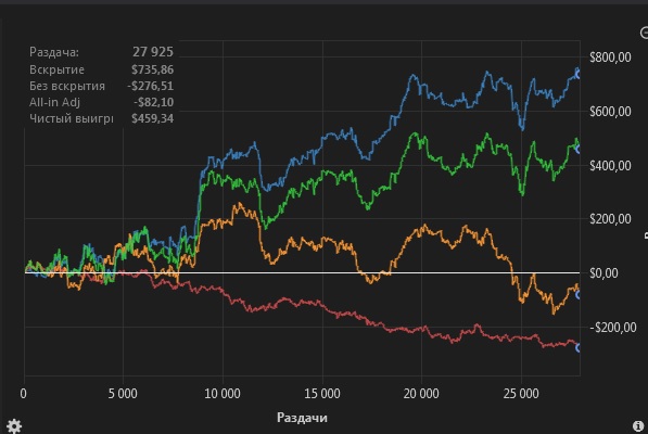 Можно вообще убрать на хрен все остальные линии и оставить только ЕВ. Потому что остальные линии показывают, опять же в моём понимании, стиль игры, а не её качество. И если ЕВ линия хоть на миллиметр, хоть на один градус отклоняется вверх от горизонта, то такой человечек может смело и спокойно играть в покер. Если он не долбоёб и будет играть по БР, то ничего страшного с ним произойти не должно.