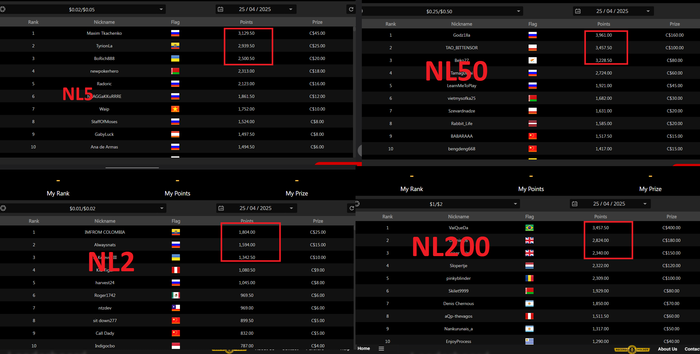 Так по таблицам видно, что на нл2 по странному копятся очки, относительно других. Наверное это говорит о том, что там больше безрейковых раздач. наверное за выигранные банки меньше 5бб на нл2 ты не платишь рейк, а на нл5 платишь, но это предположение мое. На всех лимитах в топе люди у кого больше 3000очков за сутки лб. И только на нл2 в два раза меньше очков у топов.