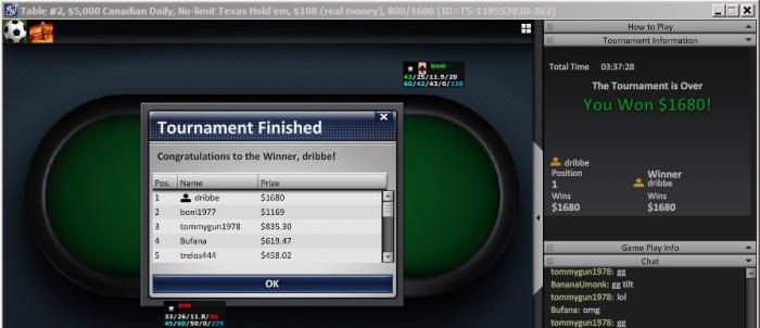 Так, что-то я в последнее время расслабился. В ослабленном режиме поиграл на этой неделе пару вечеров, потом 3 дня отдыхал... Ну, вернее, как отдыхал? В Хирое оф Спарта не только Мантикора прошел, но и подводный город нашел, и на арене 12 волн пережил, и Пегаса угнал, а уж минотавров и золотых быков вообще немеренно загасил. Понимал, что сегодня надо бы и поработать, но после вечерней встречи Барончик утащил меня в оффлайн - сыграть небольшой турнирчик... Структура, увы, полный ужас, но соперники... Как же я мечтаю, чтобы покер в России опять разрешили! Оппы колируют рейз с утг на в средней на четверть стека (правда, против моих ловят изи флоп , на котором я не могу не дать кб ) или еще красивее: человек делает рейз со стеком 12м и снепколл оллина от стека 10м на (жалко только, что оллин ставил я с , а дилер сразу положил на флоп)... В общем, за двумя столами, где я играл 4 часа, был только один приличный игрочок ("И зовут её, кажется, Даша...", тьфу, то есть Барончик... И-то этот лошара не смог с выиграть префлоп оллин на баббле финалки за 2 средних стека, у оппа изи поставившего очень приличный оллин с с утг). У меня же показатели были не ахти. Ван визаут шоудаун = 100%, ван, вен вент ту шоудану = 12%. Оллины проиграл 6 из 6 (в 4х был сильно впереди), ну и т.д...