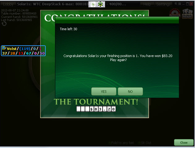 p.s. зарегился просто в какой-то тупо-лудо-турнир на 888 за 2 доллара. объехал 651 человека, и вылетел 5-м, учитывая что раза 3-4 спискался до среднего и поднимался до топ-стека. Все фиши сидели тайтово и пихали свои 12 М префлоп, поэтому когда средкий стек опустился до 5 М, я уперся с сб в бб Q8 в AQ. После чего он написал мне "nh" LoL