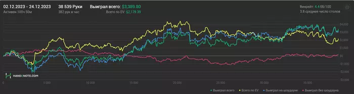 Год получился +35к, но учитывая через какую пиздорезку я прошел, то вроде бы нормальный результат. Поэтому в следующем году претендую минимум на 55-60к (играя онли200), но учитывая что буду подключать нл500 следующей осенью и пробовать, то могут быть отклонения +-15-20к в обе стороны, таким образом на следующий год я закладываю себе ожидание примерно +45k-75k, Я кстати все время играю на "перспективу" и то и дело вывожу себя из зоны комфорта. Очень многие реги +- одинакового уровня со мной играют годами одни и те же лимиты и имеют годовое ожидание выше чем мое, но из за моих постоянных стремлений попасть выше, и из за микса лимитов, из за регваров, из за того, что я не подключаю фуллринг и приложения, общие резалты получаются хуже чем у них. С одной стороны я когда-нибудь выстрелю и утру им нос, но с другой стороны, когда приходит время подводить итоги года чувствую себя дурачком ... Я искренне верю в то, что если ты хочешь стать по-настоящему крутым дядькой с большой буквы, нужно всегда выбирать более сложный и тернистый путь.