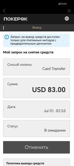 Добрый день. Подскажите пожалуста как долго выводится через кассу Покерка вчера поставил на вывод