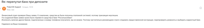 Просто дропу Шахир Оглу счет в Тиньке, куда ты по ошибке запулил бабки, скорее всего, заблочили на вывод средств, и теперь финансисты ПокерОК эти бабки физически не могут достать. Ты послал деньги туда, где с ними ничего нельзя сделать.