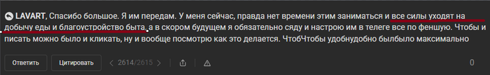 LAVART, Спасибо большое. Я им передам. У меня сейчас, правда нет времени этим заниматься и все силы уходят на добычу еды и благоустройство быта, а в скором будущем я обязательно сяду и настрою им в телеге все по феншую. Чтобы и писать можно было и кликать, ну и вообще посмотрю как это делается. ЧтобЧтобы удобнудобно былбыло максимально