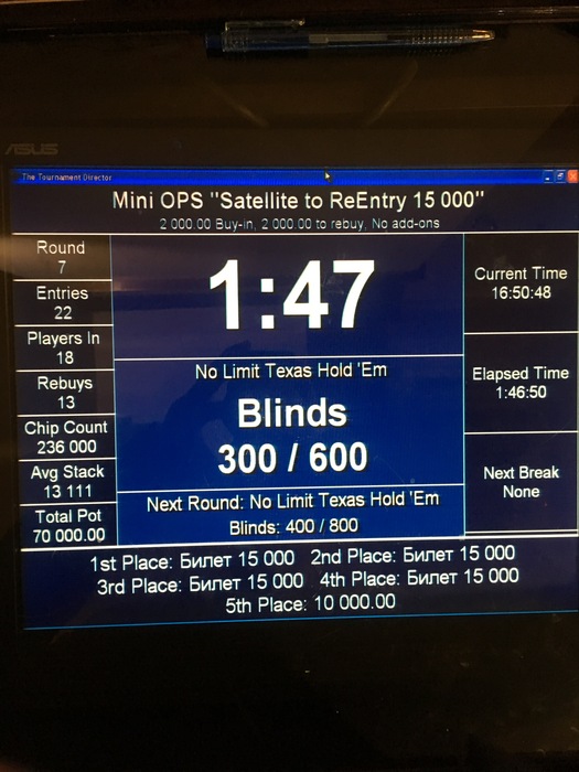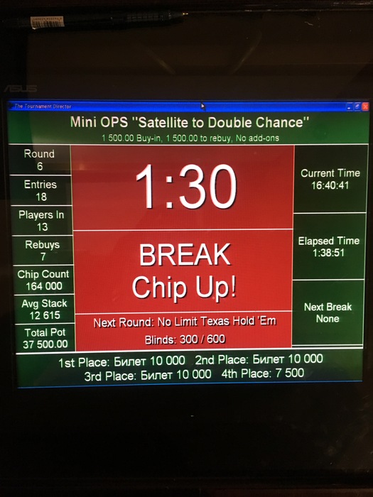 15:00 Turbo Satellite to Double Chance в формате ReEntry по 1 500 руб. Гарантия 30 000 (3 билета) _ стартовый стэк 6 000 _ стэк на Rebuy 8 000 _ поздняя регистрация 6 уровней _ Rebuy можно сделать в течении первых 6 уровней _ длительность уровней по 6*15/12 мин