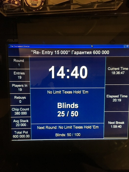 18:00 Турнир BOUNTY Re- Entry по 15 000 руб (bounty 5 000) Гарантия 600 000 руб _ стартовый стэк 15 000 _ стэк на Re-Entry 15 000 _ поздняя регистрация и период Re-Entry 8 уровней _ длительность уровней 8*35/ 30 мин