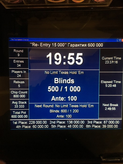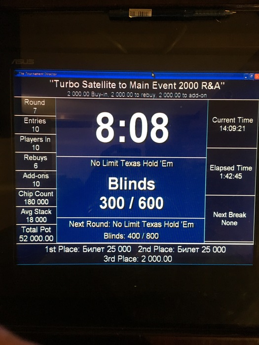 Застраховали 7 место на 25 000 руб 6 место 50 000 руб А оставшись в пятером поделили 2- 5 места по 175 000 Победителем турнира стал Руслан из Новочеркасска, который унёс с собой 225 000 руб и кубок победителя