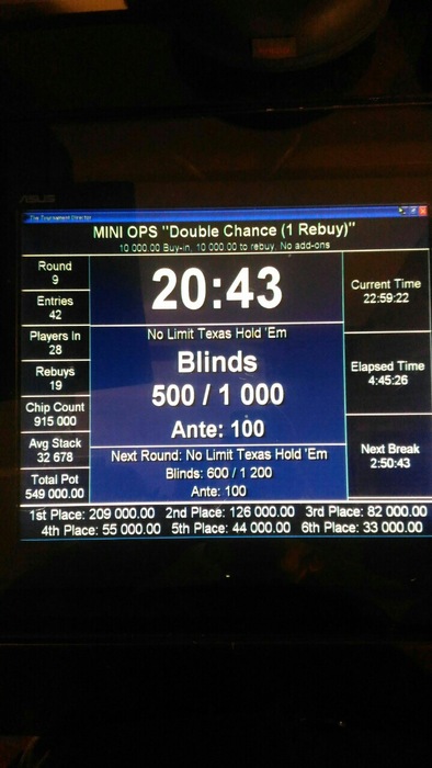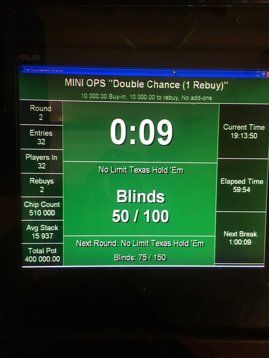 18:00 Double Chance (1 Rebuy) по 10 000 руб Гарантия 400 000 руб. _ стартовый стэк 15 000 _ стэк на Rebuy 15 000 _ поздняя регистрация и Rebuy период 8 уровней _ длительность уровней по 30 мин