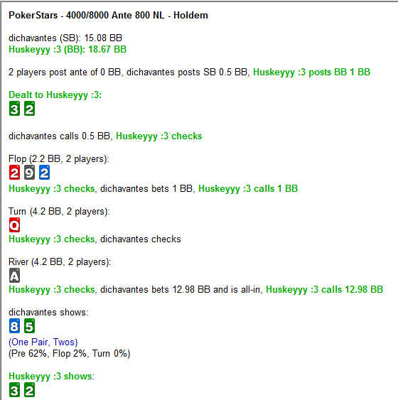 2017 год: Тот год выдался для меня крайне трудным. Наверное, самый хуевый год за последние 22 года. В покере удалось вытянуть из аппарата очень мало денег. Ловил слишком много стриков, огромнейшая недодача по фишкам и бб ; куча потраченных нервов. КАК ЖЕ Я ЗАЕБАЛСЯ СОСАТЬ ХУЙ, КОГДА НА ПРОТЯЖЕНИИ 3-5 МЕСЯЦЕВ ТЕБЯ БЕЗПРОСВЕТНО ЕБУТ В ОДНОСТОРОННЕМ ПОРЯДКЕ. Честно я уже заебался, не раз появлялись мысли забить хуй на эту игру и искать для себя что-то новое. В любом случае определенные выводы для себя относительно покера уже сделаны, осталось дождаться дембеля и начинать воплощать в жизнь свои планы и мысли. А покер? считаю что я буду продолжать играть в эту игру, но буду рассматривать её немного с другого ракурса - как доп заработок, хобби. В любом случае, у меня еще есть где-то годик для того чтобы реализовать себя в этой игре.