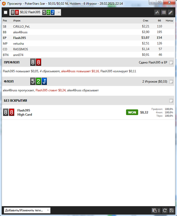 Но это только советовать хорошо, мы всегда играем от опонента. Там уже понятно, что делать с твоей рукой. Ты посчитал, что такой розыгрыш будет для тебя наилучшим, но получилось, как получилось. Непростая раздача и её не было бы если бы ты сбросил на 3бет.