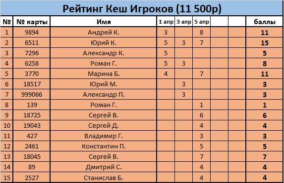 Дорогие друзья! С 1 апреля мы начали собирать накопительный призовой фонд, которые разыграют топ 18 Кеш игроков в бесплатном турнире 29 апреля в 21:15. Призовой фонд формируется из 1 у.е., которые удерживаются с каждого банка от 20 у.е. и выше. Стек в рейтинговом турнире, будет зависеть от кол-ва отыгранных часов за весь период времени и умноженный на определенный коэффициент. Призовых мест 9. Для начисление баллов и накопления призового фонда, должно быть минимум 4 участника за кеш столом. Предоставленная таблица рейтинга актуальна на 5 апреля 2019г. Ждём всех желающих на рейтинг гонку!